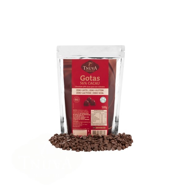 Embalagem com 500g de Chocolate 56% Cacau em formato de gotas para uso culinário - Zero leite, Zero Glúten, Zero Soja, 100% Vegano- Zero Leite, Zero Glúten, Zero Soja, 100% Vegano