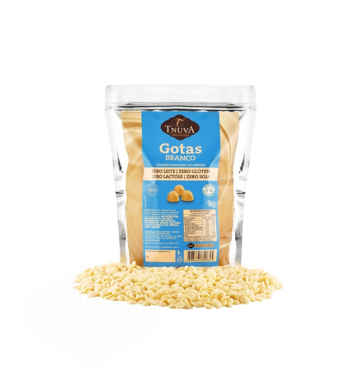 Embalagem com 1,01kg de Chocolate Branco em formato de gotas para uso culinário - Zero leite, Zero Glúten, Zero Soja, 100% Vegano- Zero Leite, Zero Glúten, Zero Soja, 100% Vegano