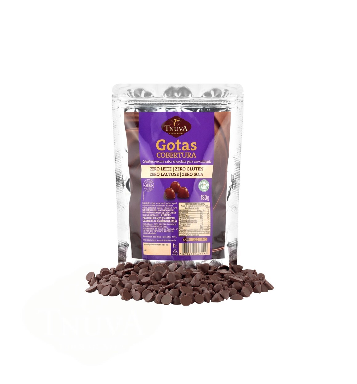 Embalagem com 180g de Cobertura Sabor Chocolate em formato de gotas para uso culinário - Zero leite, Zero Glúten, Zero Soja, 100% Vegano- Zero Leite, Zero Glúten, Zero Soja, 100% Vegano