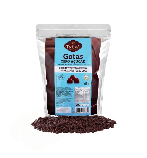 Embalagem com 1,01kg de Chocolate 56% Cacau Zero Açúcar em formato de gotas para uso culinário - Zero leite, Zero Glúten, Zero Soja, 100% Vegano- Zero Leite, Zero Glúten, Zero Soja, 100% Vegano